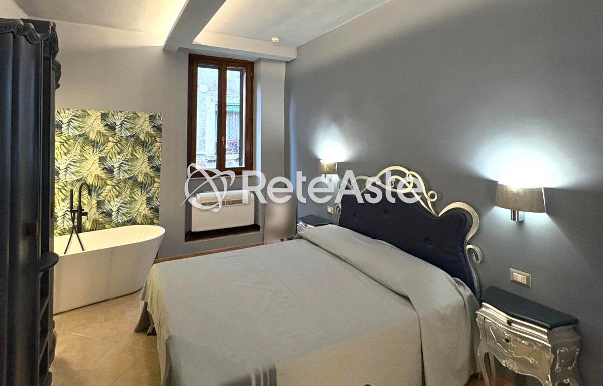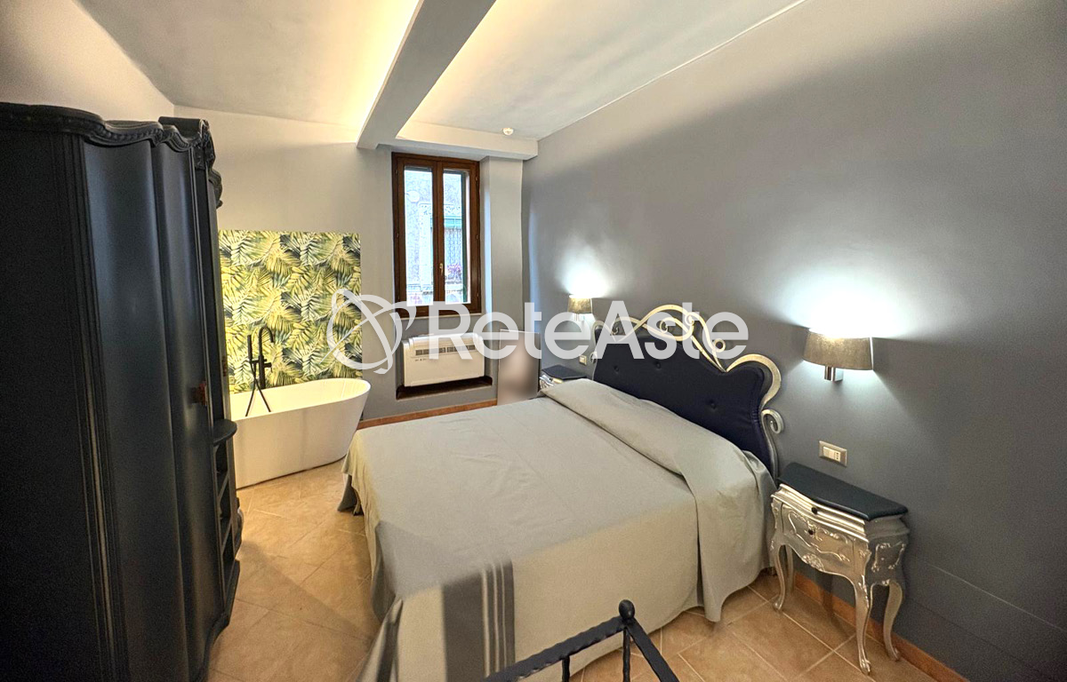 The house stands out for the particular articulation of the spaces, distributed in a functional and welcoming way. The living room with a kitchenette on the ground floor is enriched by an antique walnut root table, restored in silver leaf, and two Pop Art style armchairs, creating an elegant contrast between classic and contemporary. On the first floor, there is a bedroom with warm and relaxing tones, tastefully furnished and characterized by a repainted Chippendale wardrobe from the 1900s and a refined silver leaf bed. In the same room, there is a splendid relaxation tub, which contributes to creating an intimate and relaxing atmosphere. The basement floor houses a practical cellar.