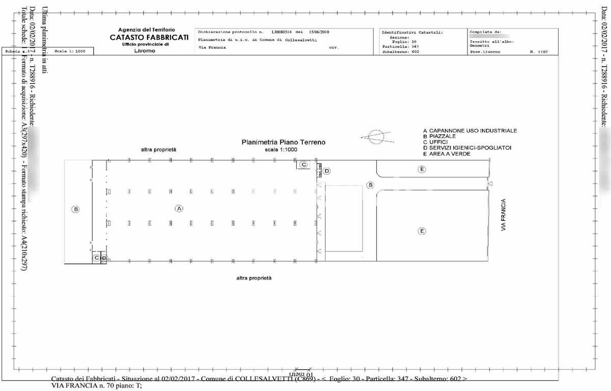 Entrepôt situé dans la fraction de Guasticce, précisément en périphérie de l'agglomération urbaine dans la zone industrielle. Cette zone est bien desservie par les principales voies de circulation car elle est proche de la S.G.S. FI-PI-LI Livourne – Florence et de l'autoroute Gênes-Rosignano M.mo. L'entrepôt a une forme rectangulaire et est développé sur un seul niveau hors sol. Le tout est entouré d'une cour asphaltée et d'une zone pavée. La zone est clôturée par un muret en béton armé surmonté d'une grille métallique, avec un accès carrossable équipé d'un portail automatique.