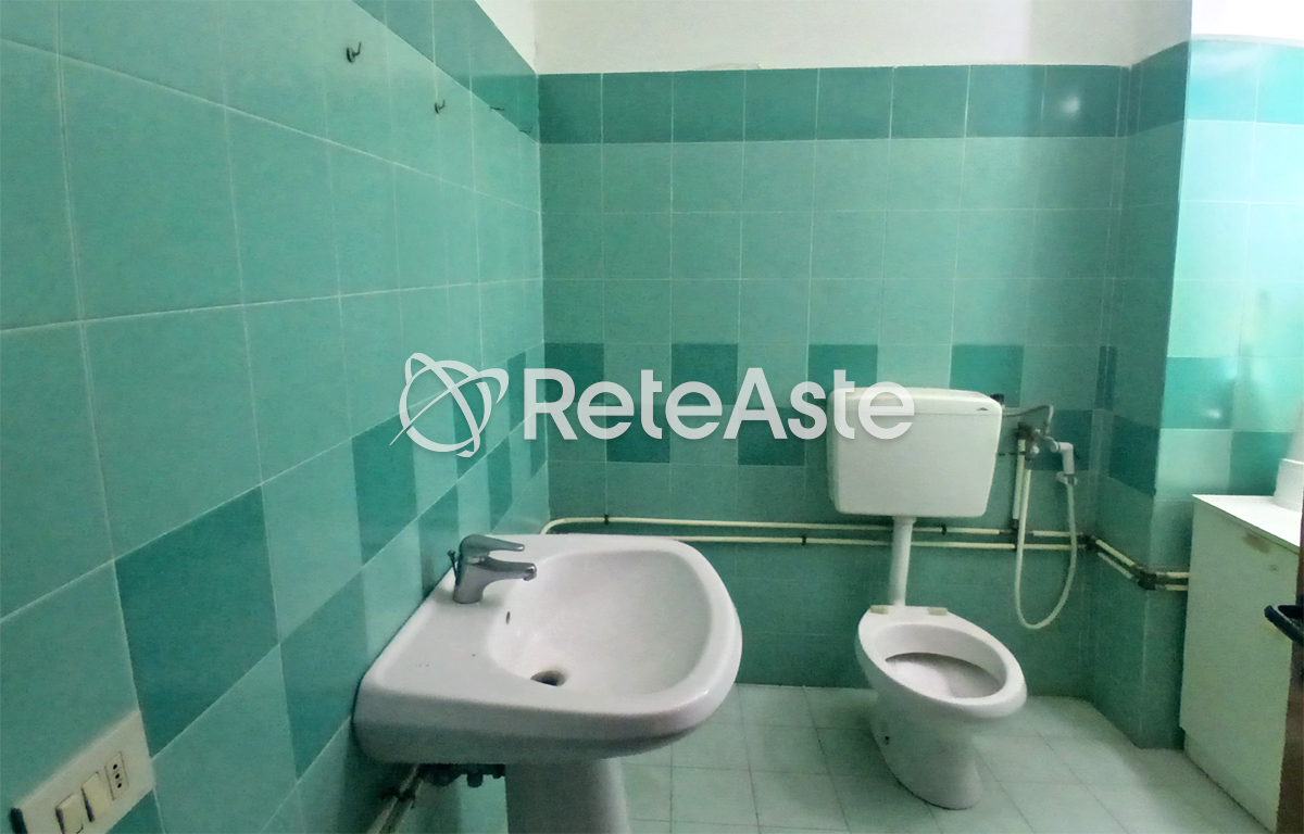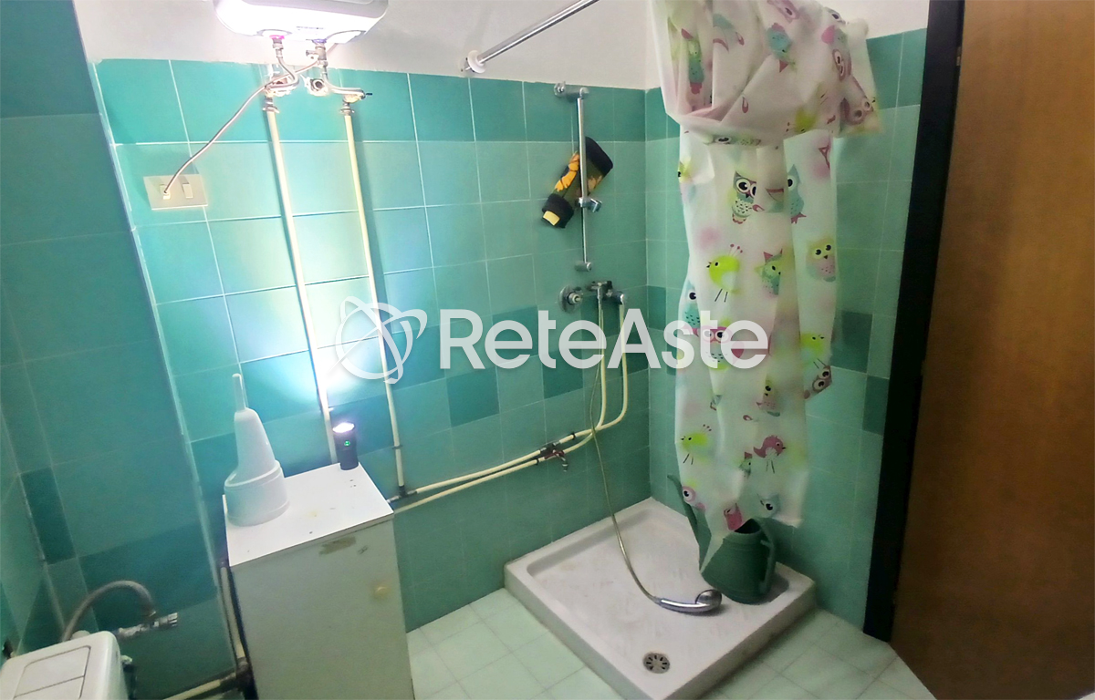 Il servizio igienico, completo e dotato di doccia, è rifinito con piastrelle nei toni del verde e dell’azzurro. È inoltre presente un vano archivio già attrezzato con scaffalature metalliche.